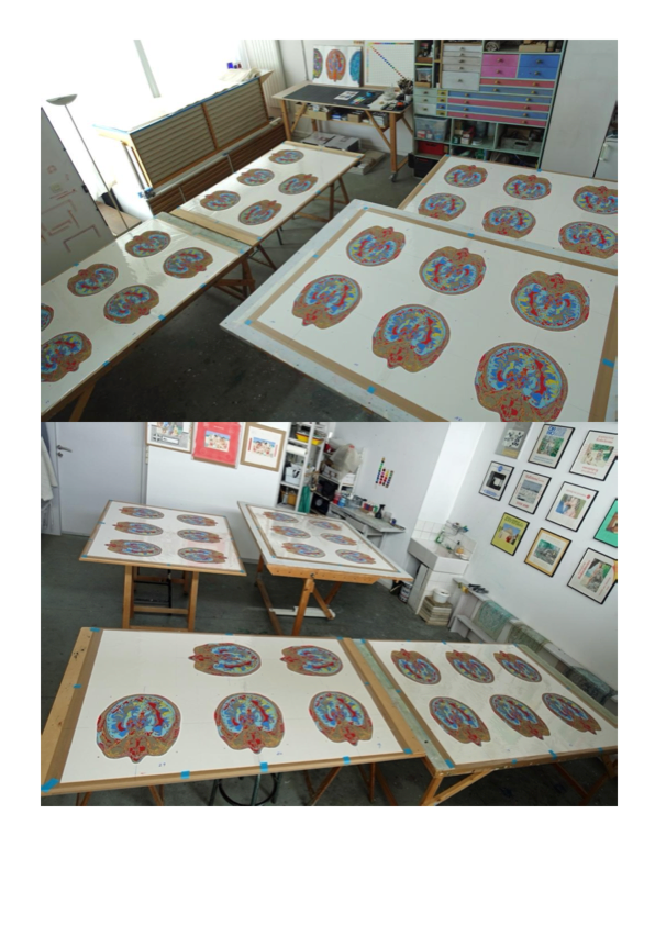 L’origine de son travail autour de coupes IRM de cerveaux remonte à la commande publique pour la création de vitraux pour la cathédrale Notre Dame de Rodez, en 2003.