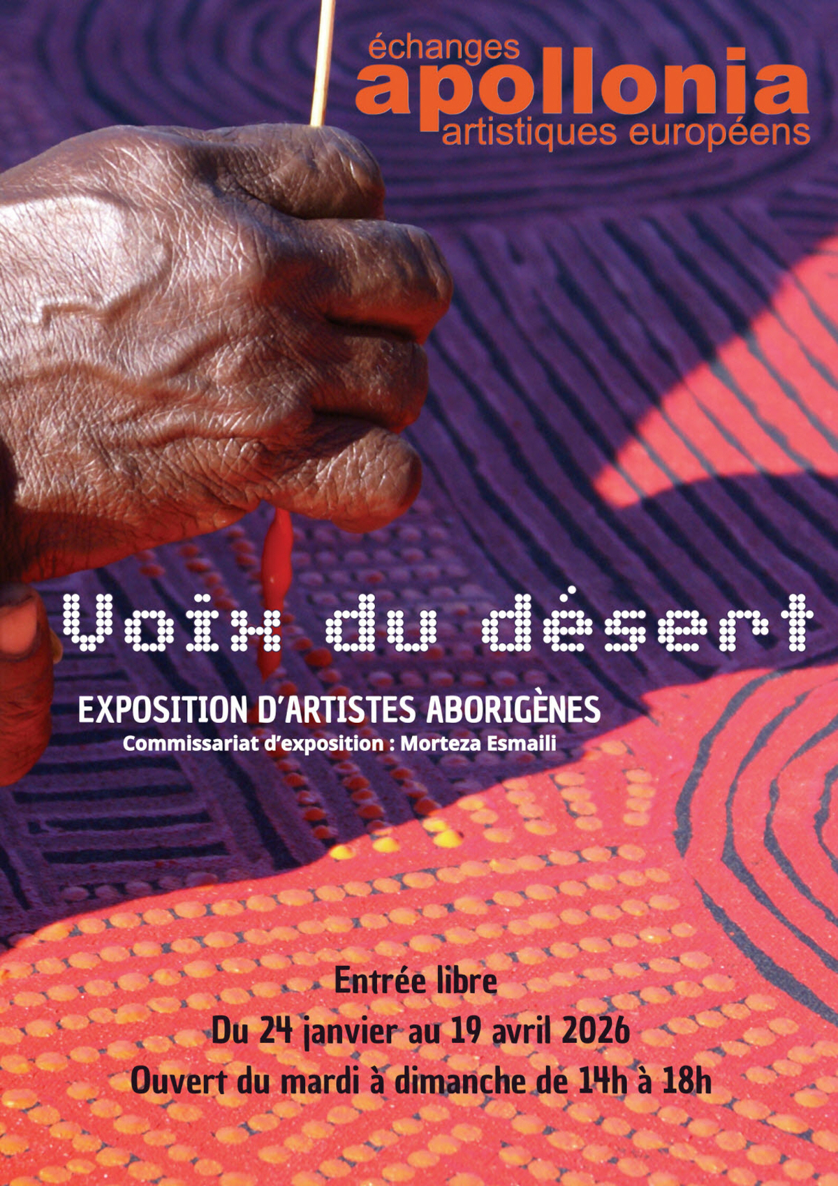 Apollonia présente une exposition majeure consacrée à l’art aborigène, réunissant des œuvres de 21 artistes emblématiques de cette culture millénaire. Reflet d’une culture imprégnée dans le sacré et le symbolisme, l’exposition « Voix du désert » repose sur un art millénaire, dont la reconnaissance fut véritablement établie à partir des années 70. Ce dernier interroge les signes premiers de la création : la ligne, le point, le cercle ; utilisés par les artistes aborigènes, qui inscrivent dans leurs œuvres la mémoire du Temps du Rêve — ce moment fondateur où les Ancêtres façonnèrent le monde et relièrent les êtres à la nature. Les formes et motifs composés tissent une signification en lien à la spiritualité et aux récits ancestraux, leurs peintures devenant un langage sacré, une cartographie spirituelle de la Terre, un pont entre visible et invisible. Par la répétition du geste, par la vibration du signe, ils perpétuent une vision cosmique où chaque forme exprime la présence des éléments et des esprits.